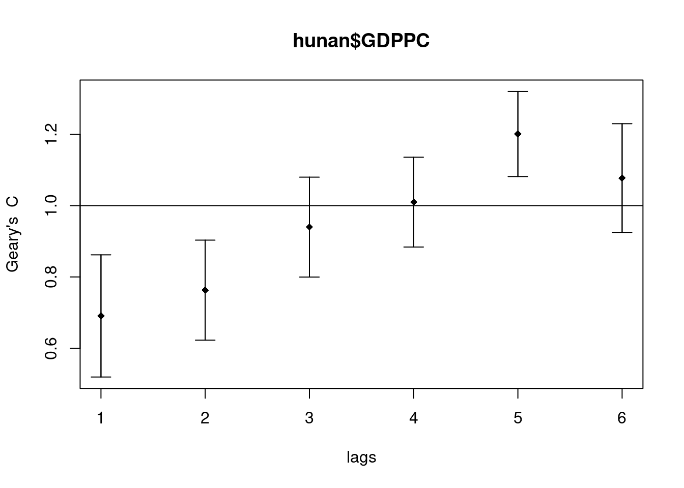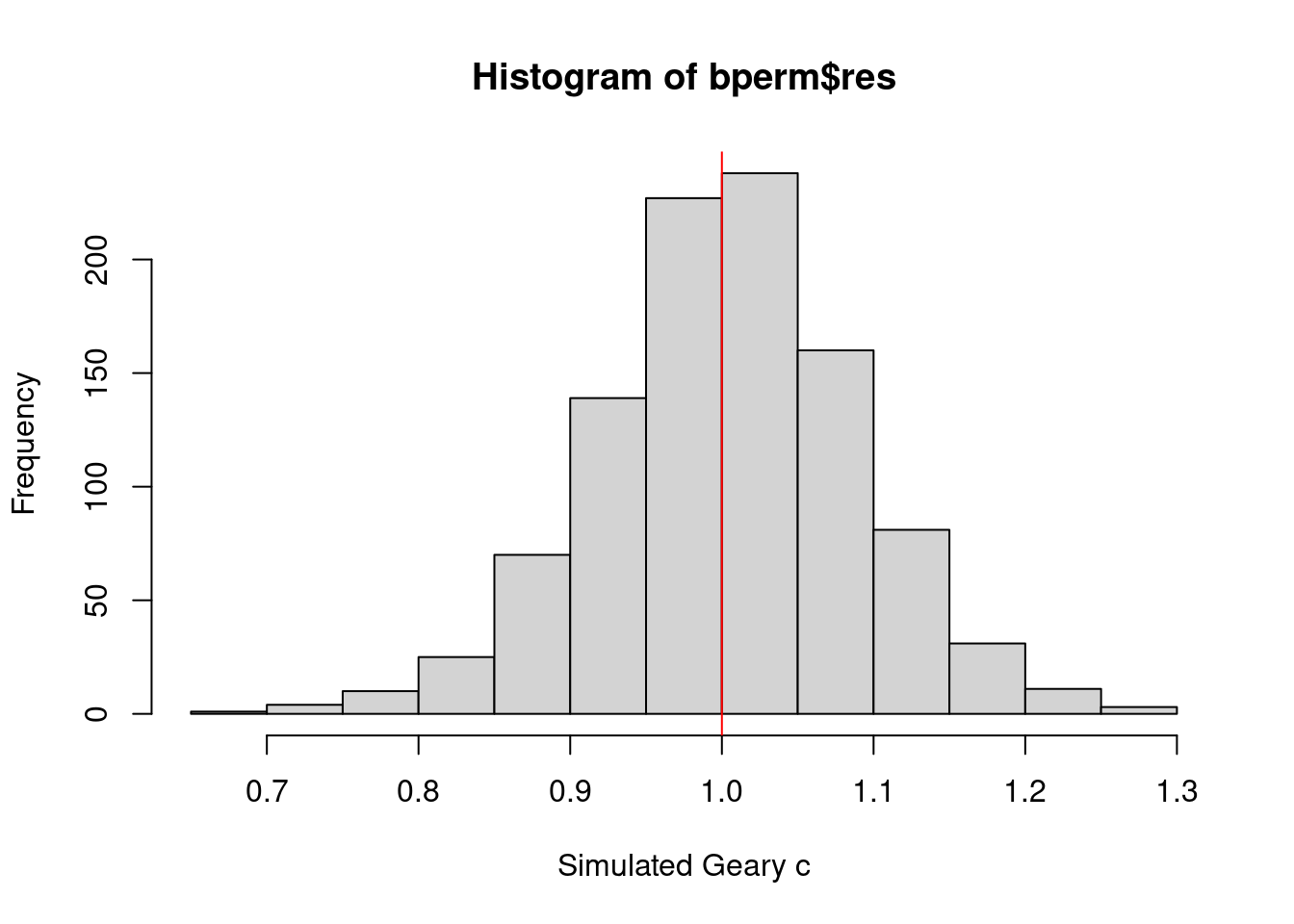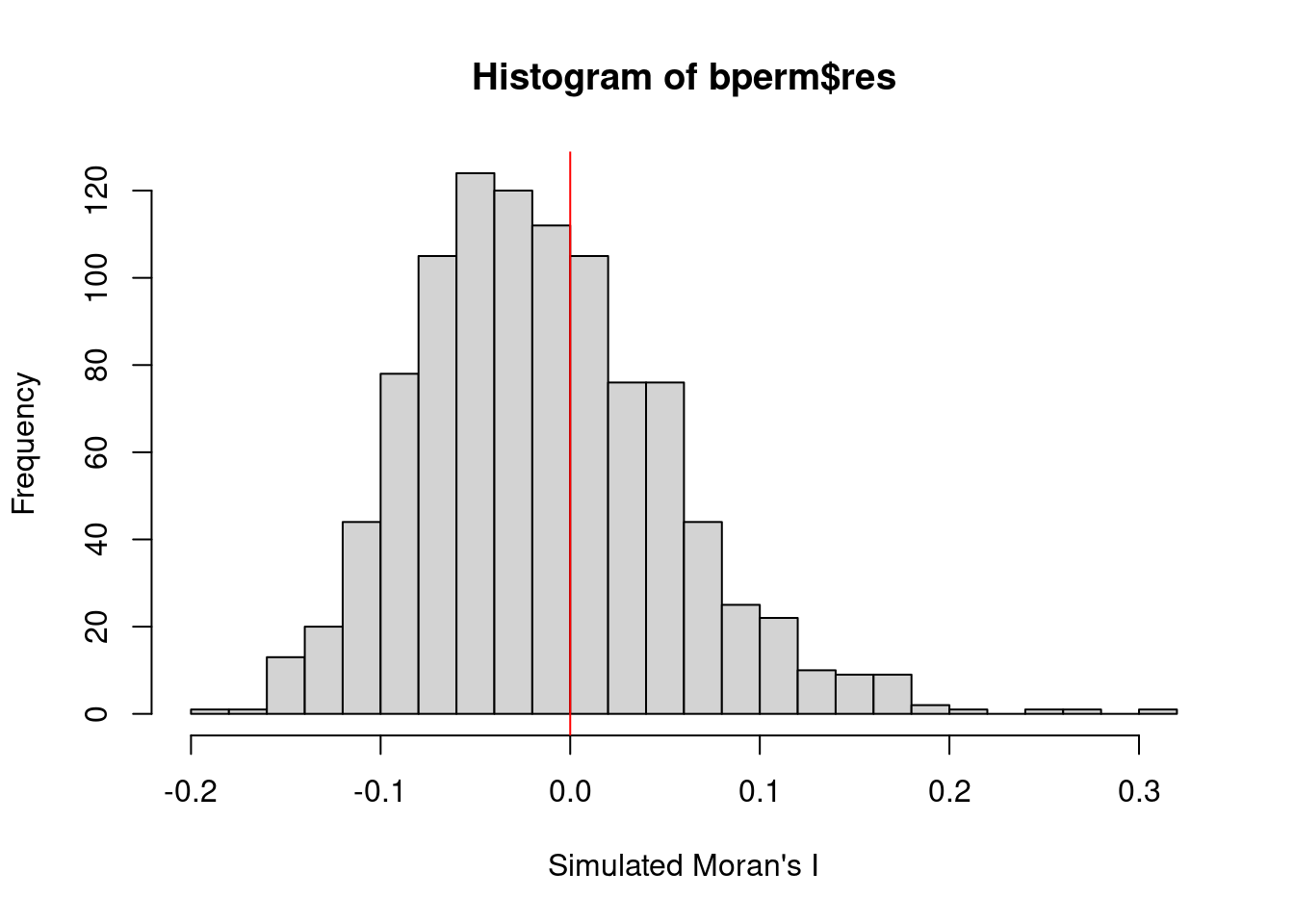 We perform a Monte Carlo permutation test for Moran’s I to assess spatial autocorrelation in the GDPPC variable from the hunan dataset.