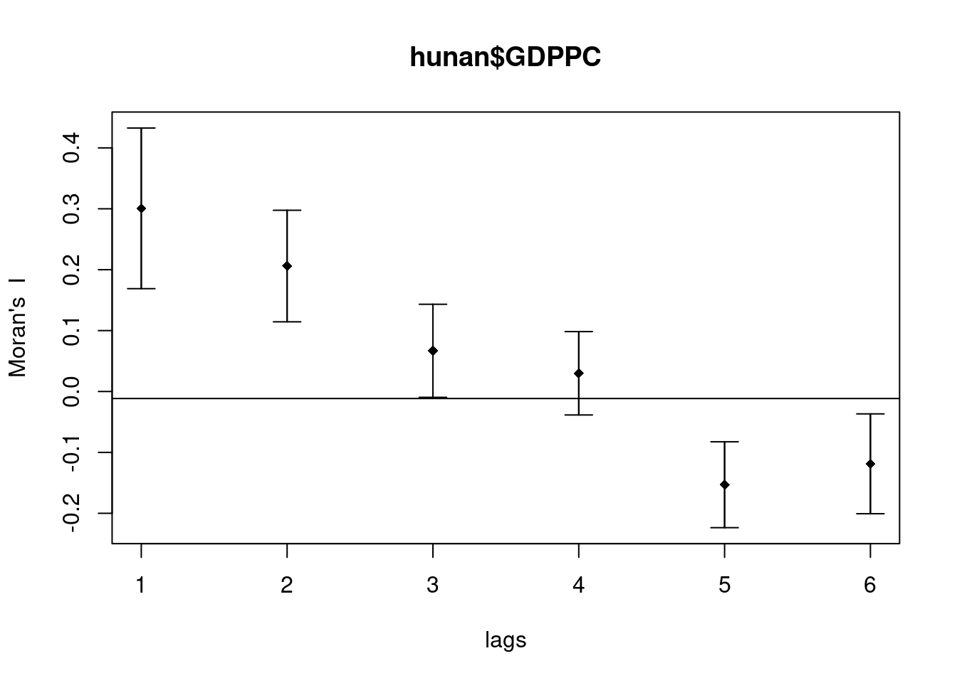 compute and plot spatial correlogram using appropriate function of spdep package.
