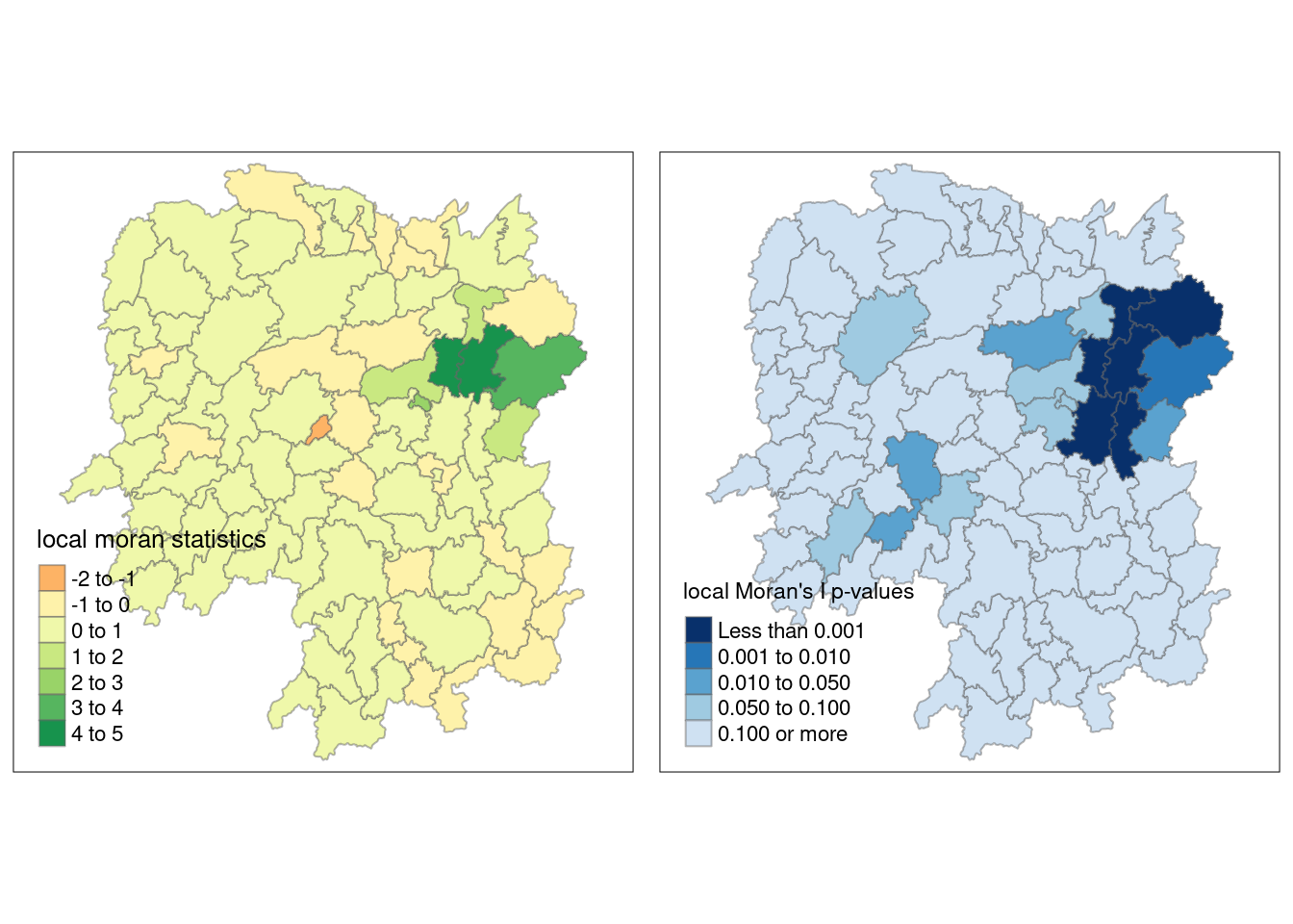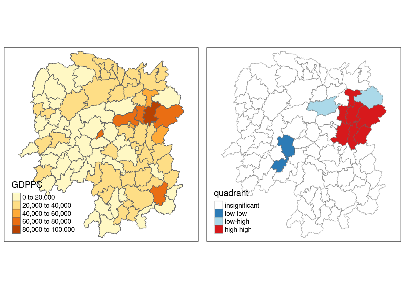 tmap_arrange(gdppc, Gimap, asp=1, ncol=2)Variable(s) "gstat_fixed" contains positive and negative values, so midpoint is set to 0. Set midpoint = NA to show the full spectrum of the color palette.