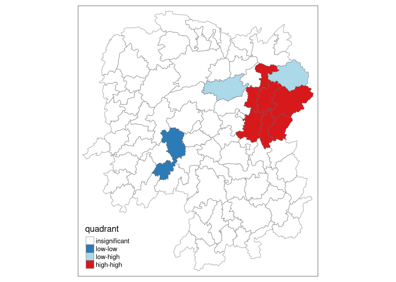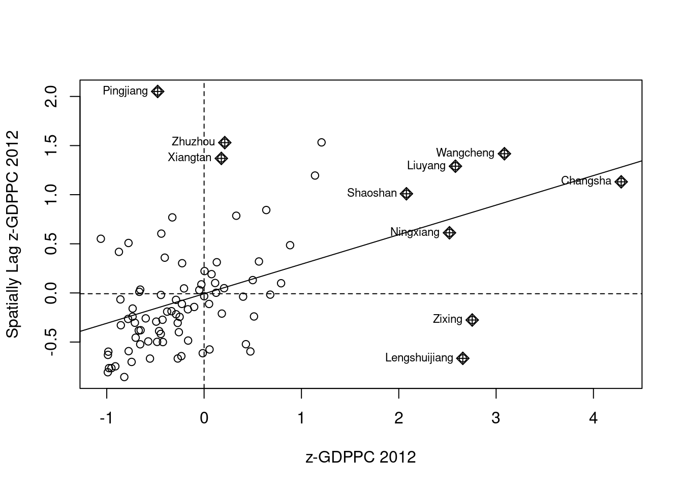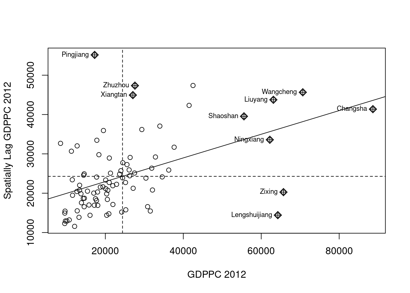 Thus, the results show a clear pattern of positive spatial autocorrelation in GDP per capita, where neighboring regions exhibit similar values.