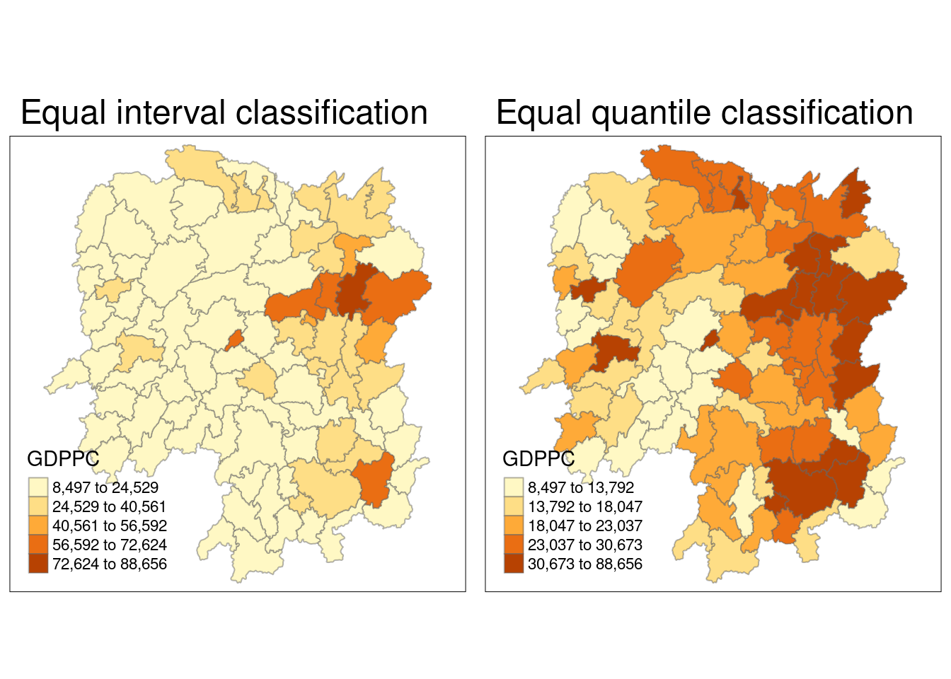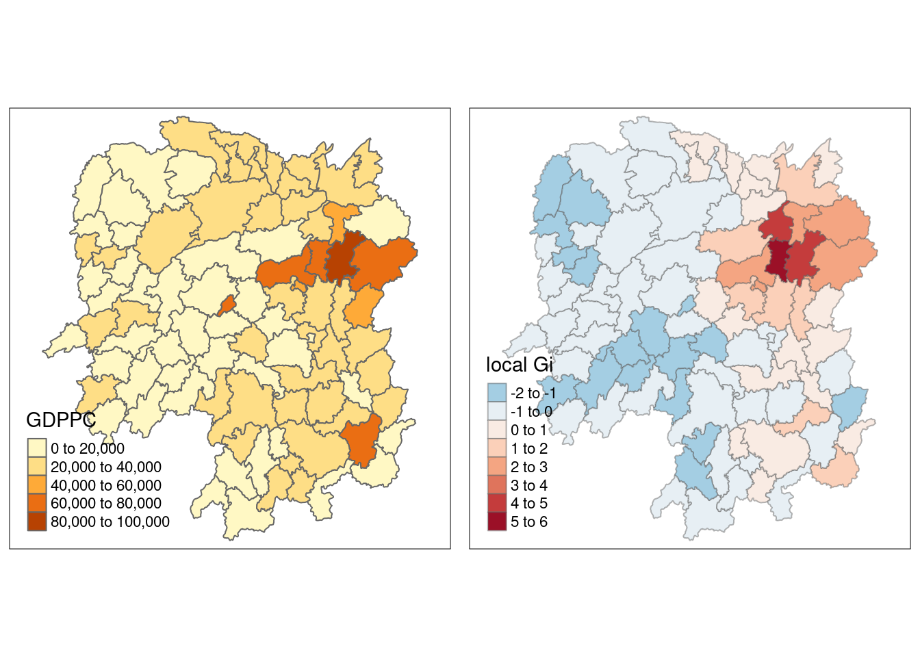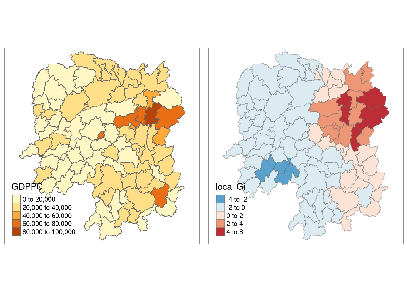 rename(gstat_adaptive = as.matrix.gi.adaptive.)gdppc<- qtm(hunan, "GDPPC")